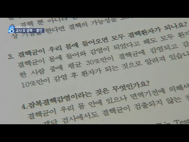 ◀ANC▶ 2학기 개학과 함께 교사들의 결핵감염이 잇따라 확인되면서 추가 감염 걱정이 큽니다. 사전 예방관리는 되고 있는지 개인적으로는 어떻게 예방해야 하는지 알아봅니다. 양관희 기자입니다. ◀END▶ ◀VCR▶ 결핵으로 격리된 고등학교 교사는 지난 달 18일 건강검진 결과에서 폐 이상소견을 받았습니다. 이후 결...