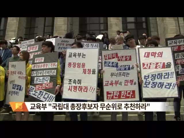 ◀ANC▶ 교육부가 국립대 총장 후보자 임용제청을 잇따라 거부하면서 총장 공백사태를 겪고 있는 국립대가 늘고 있는데요, 이런 상황에서 교육부가 총장직선제를 하더라도 후보자를 무순위로 추천하라고 통보해 거센 반발을 사고 있습니다. 조재한 기자가 보도합니다. ◀END▶ ◀VCR▶ 경북대와 공주대와 방송통신대에 ...