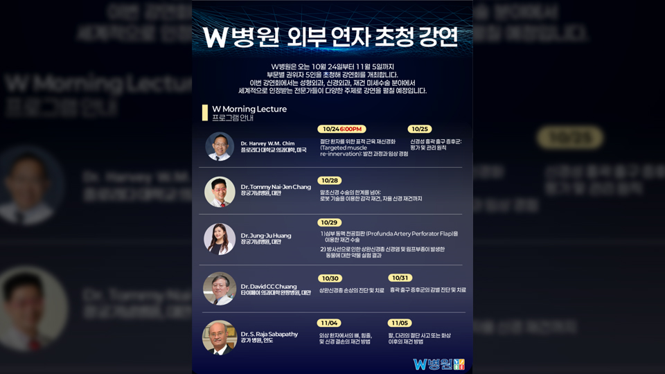 미세수술 분야에서 인정받는 권위자 5명이 대구에서 잇따라 강연회를 갖습니다.W병원은 10월 24일부터 11월 5일까지 병원 내에서 수부외과와 성형외과, 정형외과의 재건 미세수술 권위자 5명을 초청해 강연회를 엽니다.첫날인 10월 24일은 미국 플로리다의대 하비 짐 교수가 절단환자를 위한 표적 근육 재신경화를 주제로 ...