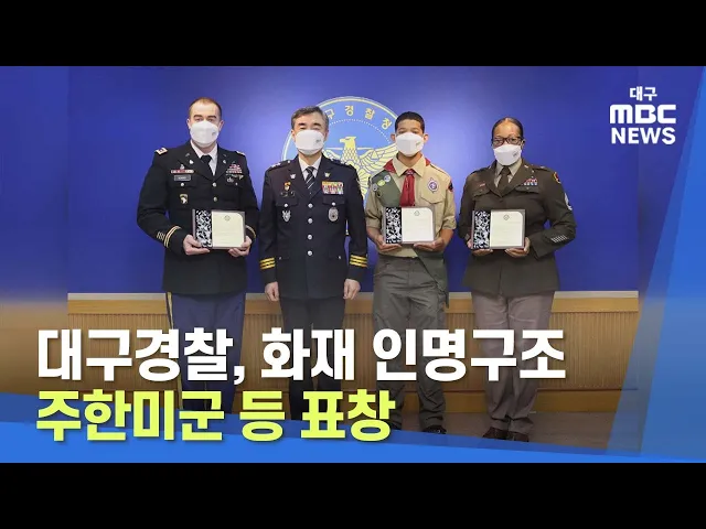 대구경찰청이 빌라 화재 때 구조 활동을 벌인 주한미군 등에게 표창장과 감사패를 수여 했습니다.대구경찰청에 따르면 지난 13일 오후 3시 반쯤 주한미군 제19 지원사령부 소속 소령과 중사, 미군 가족 등 3명이 남구 복덕동 빌라 화재를 목격했습니다.이들은 빌라 4층으로 올라가 집마다 문을 두드려 주민 15명을 대피시키...