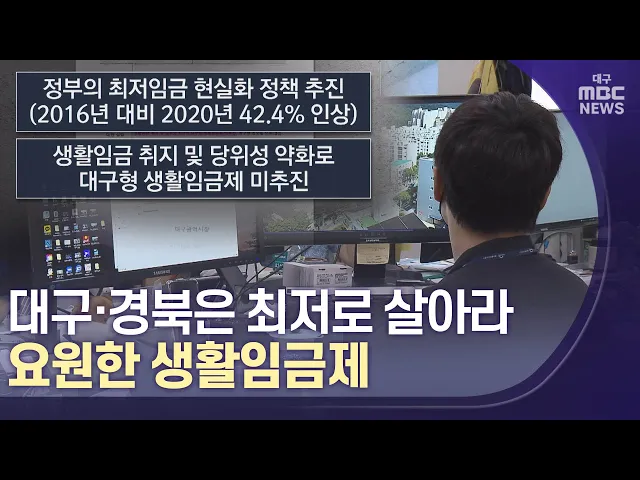 ◀앵커▶저임금 노동자의 삶의 질 개선을 위해 시행하는 '생활임금제'라는 게 있습니다. 가계지출과 주거비, 교육비 등 지역특성을 반영해 지자체를 비롯한 공공기관이 산정해 소속 노동자들에게 지원하는 생활임금인데요.전국 14개 시·도는 생활임금제를 도입했지만 유일하게 대구와 경북만 손을 놓고 있습니다.양관희 기자...