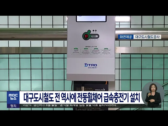 대구 도시철도 전 역사에 전동휠체어 충전기가 설치됐습니다.대구도시철도공사는 전동휠체어와 전동스쿠터 등을 위한 전동보장구 급속충전기를 1·2·3호선 전 역사에 설치했습니다.급속충전기는 역사 운영시간인 오전 5시 반부터 자정까지 무료로 쓸 수 있습니다.대구도시철도공사는 앞으로도 교통약자 복지 서비스를 위해 ...