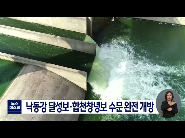 장마로 낙동강 수위가 올라갈 것으로 예상돼 보 수문이 완전히 개방됐습니다.한국수자원공사 낙동강보관리단은 달성보의 수문을 오늘 오후 3시 50분부터 완전히 열어 초당 5천780세제곱미터의 물을 방류하고 있다고 밝혔습니다.합천창녕보도 오늘 오후 4시 10분부터 모두 개방해 초당 6천90세제곱미터의 물을 보내고 있습니...
