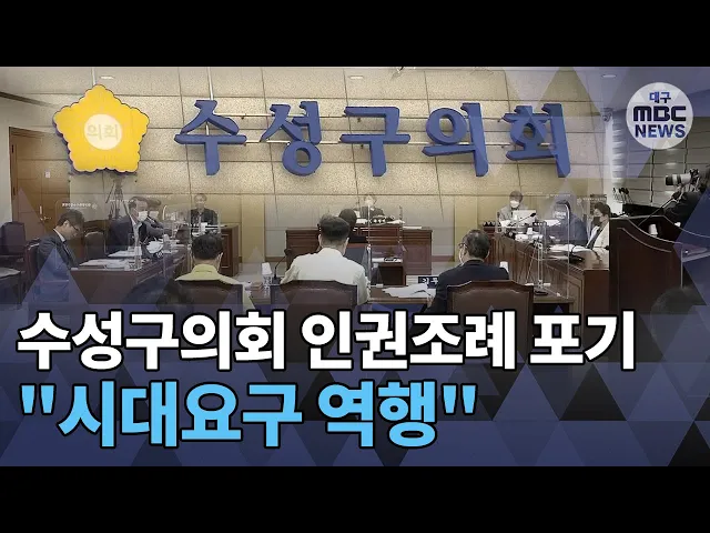 ◀ANC▶대구 수성구의회가 추진한 인권 조례안이 상임위 문턱을 넘지 못 하고 부결됐습니다.추진 과정에서 일부 주민, 종교단체 등이대량의 항의 문자와 전화를 의원들에게 쏟아내며 조례안에 거세게 반대했는데요.다른 쪽에서는 의회가 타당한 이유 없이 부결시켰다며 규탄하는 목소리가 나오는 등논란이 계속 되고 있습...