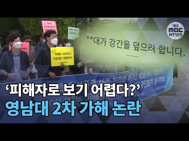 ◀ANC▶영남대학교 교수가 자신의 실명을 밝히며동료 교수에게 성폭행을 당했다고청와대 국민청원에 글을 올렸다는소식 전해드렸는데요.글을 올린지 일주일만에 20만 명이 넘는 사람들이 청원에 동의하며진상 규명을 촉구하고 있는데요.어찌된 일인지 영남대학교 측은이 교수에게 2차 가해를 가한다는 논란이 일고 있습니...