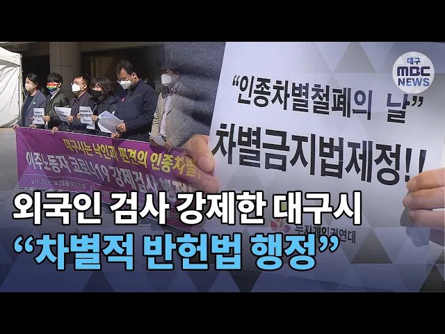 ◀ANC▶대구시가 외국인 노동자에게 코로나19 검사를 강제하는 2차 행정명령을 내렸습니다. 외국인 노동자가 3명 이상 고용된 사업장에서일하는 모든 외국 노동자가 대상인데요.서울 등 지자체는 모든 외국인 노동자에게검사를 받으라는 행정명령을 내렸다가인종차별이라는 문제 제기가 잇따르자 철회했는데, 대구시는 아...