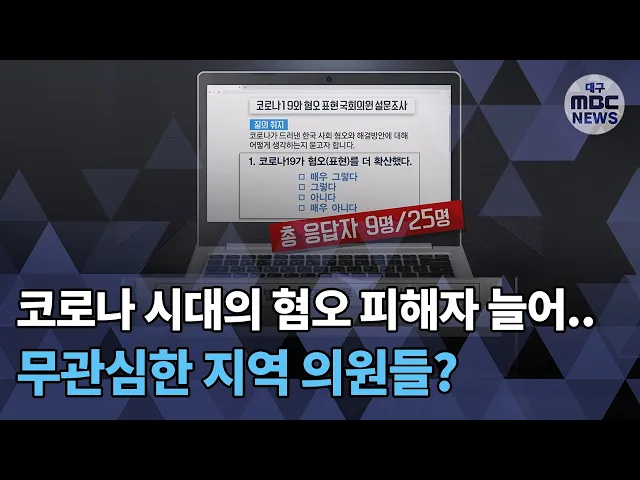 ◀ANC▶코로나 시대에 혐오와 차별은 대구 사람들을 향해서도 강하게 쏟아졌습니다. 시민사회단체와 전문가들은 이런 병폐를 줄이기 위해 차별금지법 제정을 촉구하고 있는데요.대구MBC가 지역 국회의원들에게 관련 설문조사를 보내봤습니다.과연 어떤 결과가 나왔을까요?윤영균 기자입니다. ◀END▶ ◀VCR▶코로나19 1...