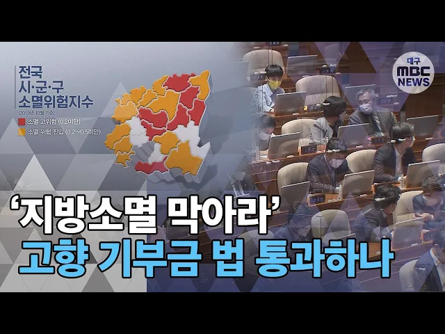 ◀ANC▶수도권 쏠림 현상이 심화하면서지역이 소멸할 것이란 위기감이점차 현실로 다가오고 있는데요.지역 공동체를 지키기 위한 방안으로고향에 기부하면 세액을 공제해주는이른바 고향 사랑 기부금 법안이국회에 제출돼 있어,통과될 지 여부가 관심을 모으고 있습니다.양관희 기자가 보도합니다. ◀END▶ ◀VCR▶지역...