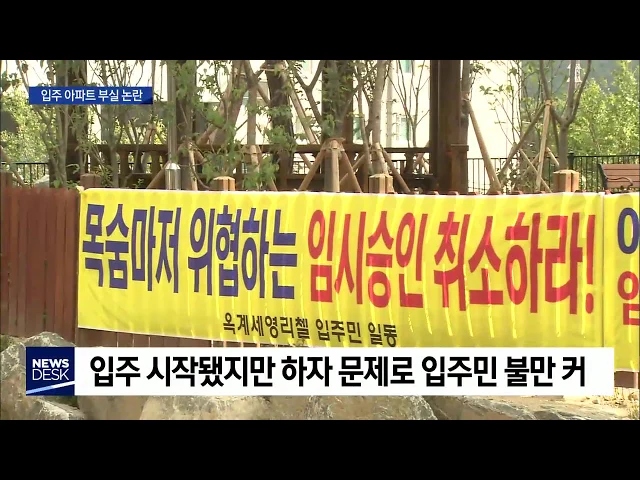 ◀ANC▶ 구미의 한 아파트 단지가 부실시공 때문에 입주민들이 큰 불편을 겪고 있습니다. 임시사용승인을 내준 구미시는 뒤늦게 잘못을 시인했습니다. 양관희 기자가 취재했습니다. ◀END▶ ◀VCR▶ 구미 옥계동에 있는 901세대 규모 세영리첼 아파트입니다. 입주가 시작됐지만, 단지 곳곳에 날림 공사를 규탄하는 현수...
