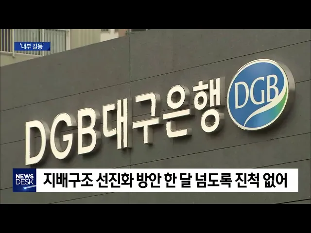 ◀ANC▶ 앞서 보신 것처럼 DGB금융그룹은 채용비리 외에도 펀드 손실금 보전 혐의로 아직 검찰수사 선상에 올라있습니다. 이런 비리가 더 이상 발붙일 수 없도록 지배구조를 바꾸는 개혁을 추진하고 있지만 진척이 없습니다. 내부갈등도 심상치 않아 보입니다. 양관희 기자가 보도합니다. ◀END▶ ◀VCR▶ 대구은행 출신...