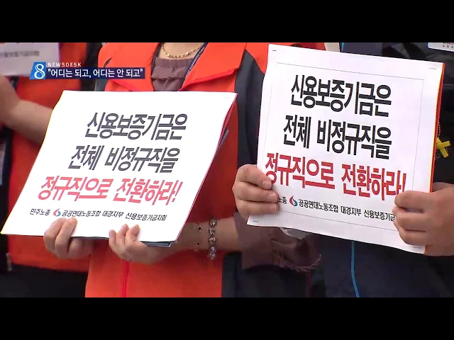 ◀ANC▶ 출연 공공기관인 신용보증기금에서 고객센터 업무를 보던 비정규직원들이 경고 파업에 나섰습니다. 다른 공공기관과는 다르게 정규직 전환대상에서 제외됐다는 게 이유입니다. 양관희 기자가 보도합니다. ◀END▶ ◀VCR▶ 신용보증기금에는 보통 콜센터라고 부르는 고객센터 직원이 44명 있습니다. 기업대출을 ...