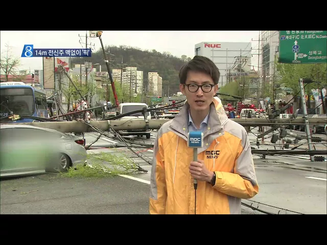 ◀ANC▶ 오늘 대구에서 택시가 전신주를 들이받았는데, 전신주들이 잇따라 쓰러졌습니다. 인근 공장과 주택가에 정전 피해가 났고, 길도 완전히 막혀버렸습니다. 양관희 기자가 보도합니다. ◀END▶ ◀VCR▶ 비 오는 왕복 6차선 도로에서 갑자기 14m 전신주가 쓰러집니다. 이어 다른 전신주들도 쓰러지며 전기 스파크가 ...