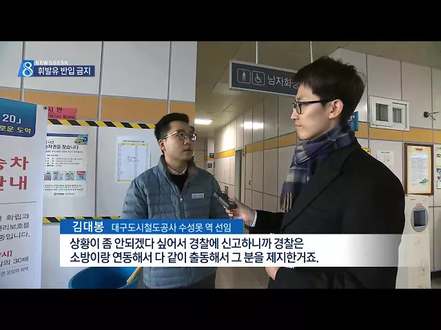◀ANC▶ 오늘 낮 대구 3호선의 한 역에 30대 남성이 휘발유를 들고 들어와 도시철도공사 직원들이 제지하는 한바탕 소동이 있었습니다. 지난 대구지하철 참사를 떠올린 당국은 소방차 15대를 긴급출동시키기까지 했습니다. 양관희 기자가 보도합니다. ◀END▶ ◀VCR▶ 오늘 오후 대구 도시철도공사 3호선 수성못 역. 30...