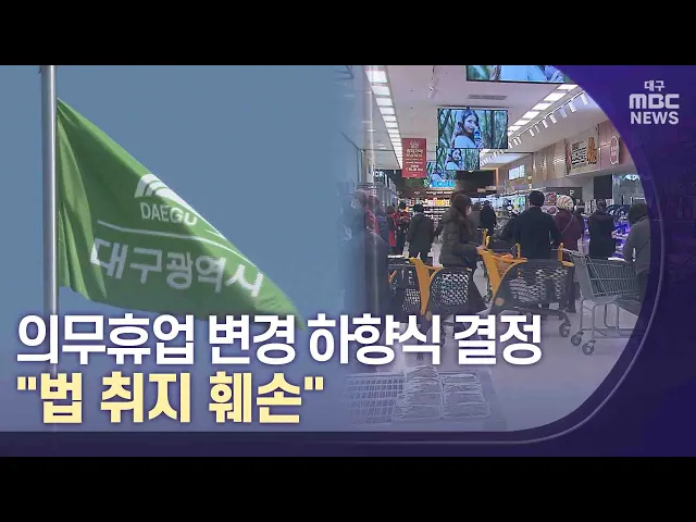 ◀앵커▶대구시는 늦어도 2023년 2,3월에는 대형마트 의무휴업일을 평일로 바꾼다고 발표했습니다. 그런데 의무휴업일 변경은 기초자치단체인 일선 구·군이 유통산업발전법에 명시된 절차에 따라 결정하도록 되어 있습니다.대구시가 이런 절차를 따르지 않고 일방적으로 발표했다는 비판이 나오고 있습니다.양관희 기자가 취...