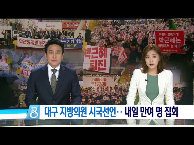 ◀ANC▶ 상상을 초월하는 국정농단사태가 속속 드러나고 있는 가운데 검찰의 대통령 수사도 임박했습니다. 그럼에도 다시 국정을 재개하고 있는 청와대를 보면 100만 촛불로 대변되는 민심에는 귀와 눈을 닫고 있는 듯 보입니다. 여] 이런 가운데, 대구의 야당 지방의원들이 시국선언을 했고, 대통령 퇴진을 외치는 목소리...