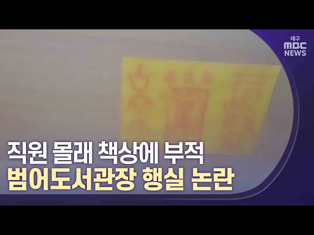 ◀앵커▶대구 수성구 범어도서관장이 직원들 책상에 몰래 부적을 붙인 사실이 드러나 논란이 일고 있습니다.주술적 의미로 붙였다는데, 이 밖에도 직원들을 상대로 사적 심부름을 시키는 등 갑질을 일삼았다는 직원들 주장도 나와 구청이 감사를 할 예정입니다.양관희 기자와 자세한 소식 알아보겠습니다. 양기자, 몰래 붙인 ...
