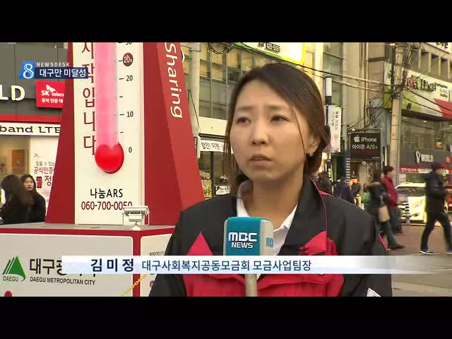 ◀ANC▶ 전국 17개 사랑의 온도탑 가운데 대구만 100도를 끝내 넘지 못했습니다. 어려운 지역경제 탓에 개인 고액기부와 기업기부가 많이 줄었기 때문입니다. 양관희 기자가 보도합니다. ◀END▶ ◀VCR▶ 대구사회복지공동모금회의 희망 2015 나눔캠페인 모금액은 67억 3천여만원으로 목표액 80억원에 미치지 못했습니다...