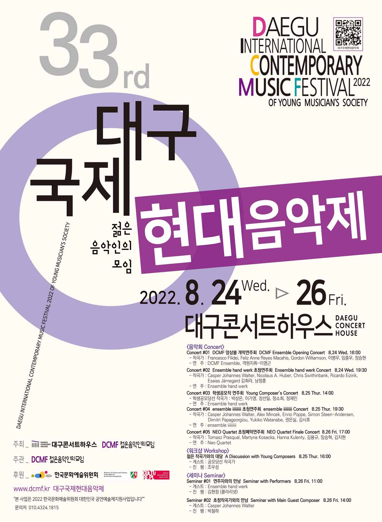 제33회 대구 국제현대음악제가 8월 24일부터 3일 동안 대구콘서트하우스에서 열립니다.대구콘서트하우스는 2022년에는 독일과 폴란드, 스위스 등 해외 현대음악 전문연주단체와 국내 유명 연주자가 참여한다고 밝혔습니다.첫날인 24일에는 대구 국제현대음악제 앙상블이 개막 콘서트를 하고 둘째 날에는 음악 전공 학생들 ...