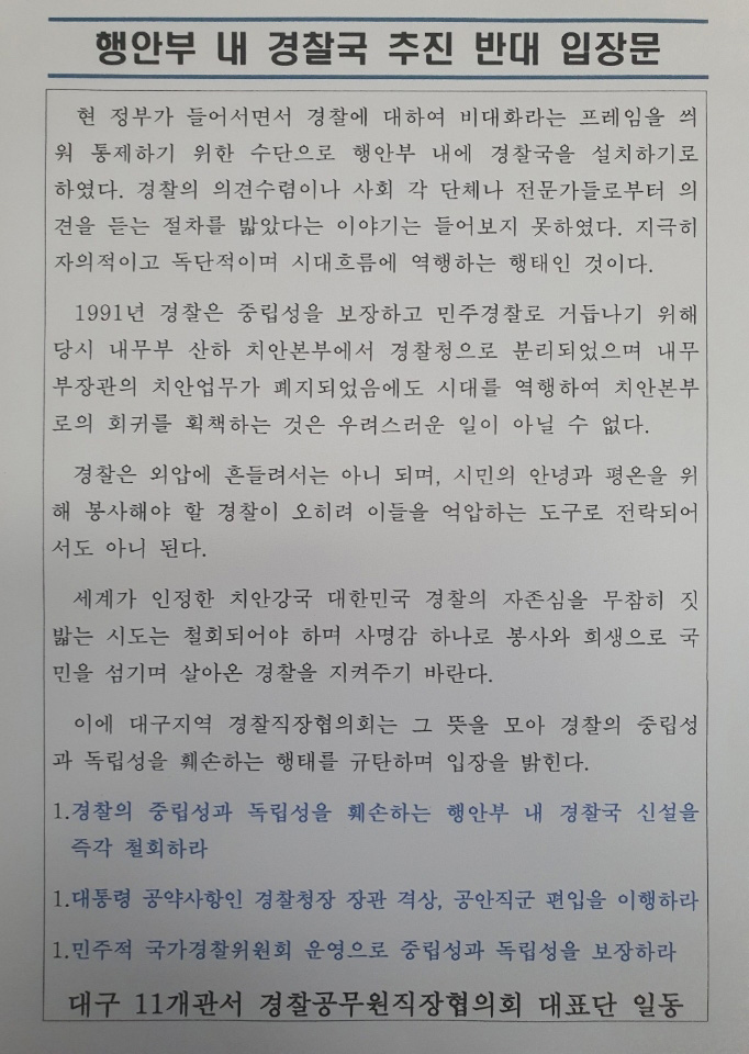 대구 11개 관서 경찰공무원직장협의회가 행정안전부 경찰국 신설을 반대했습니다.직장협의회는 입장문을 내고 "경찰의 중립성과 독립성을 훼손하는 행태를 규탄한다"라고 밝혔습니다.이들은 "경찰 의견수렴이나 사회 각 단체, 전문가들의 의견을 듣는 절차도 없었다"라며 "시대 흐름에 역행한다"고 주장했습니다.