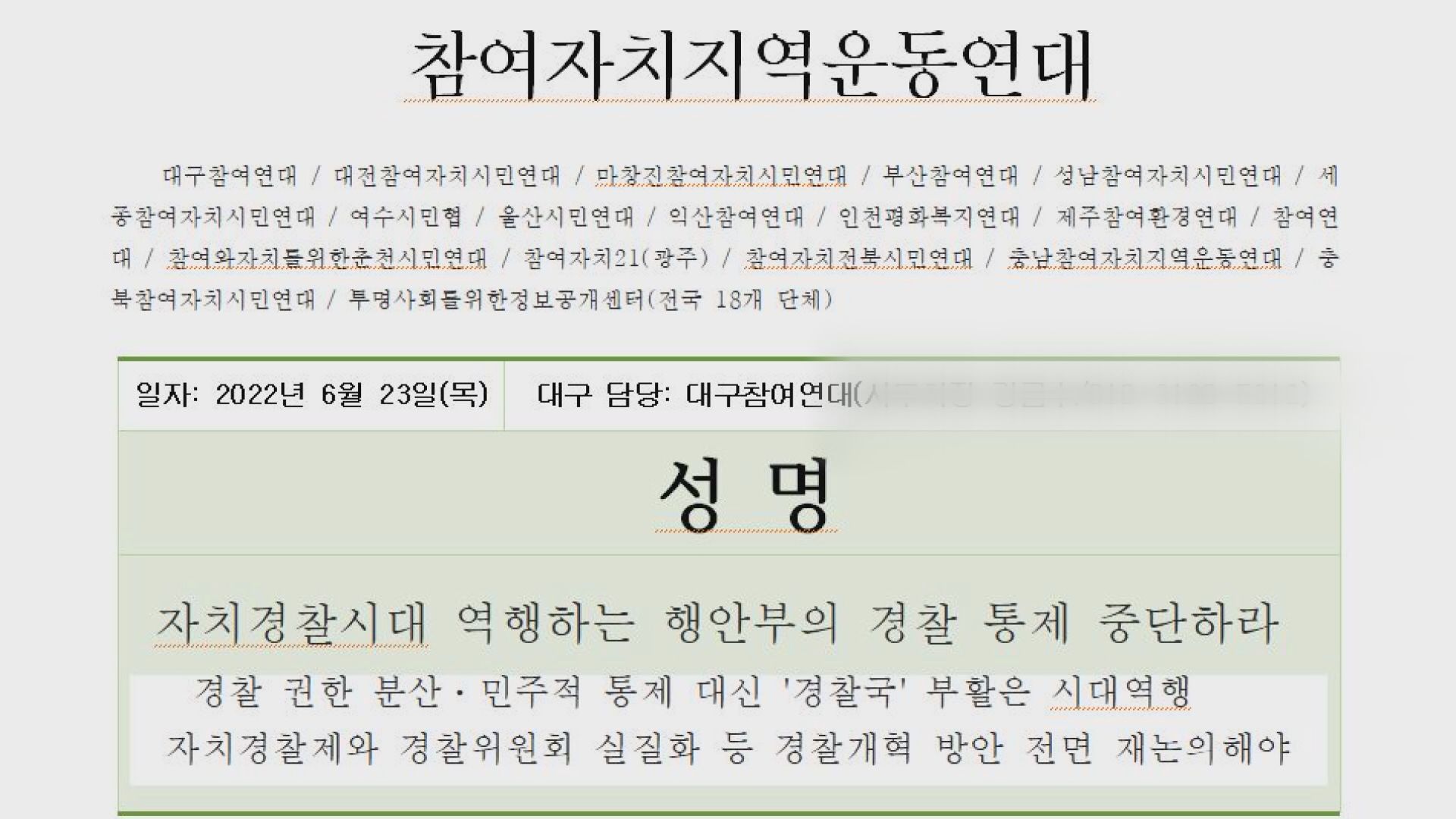 대구참여연대 등 전국 시민사회단체로 구성된 참여자치 지역운동연대가 "행정안전부의 경찰 통제를 중단하라"라고 촉구했습니다.이 단체는 성명을 내고 "경찰제도개선 자문위원회가 행안부에 발표한 '경찰 관련 지원 조직 신설'과 '행안부장관의 지휘 규정 제정' 권고안은 경찰 개혁과 자치분권을 거스른 중앙정부의 경찰 ...
