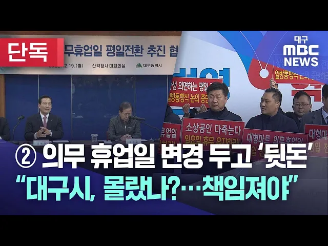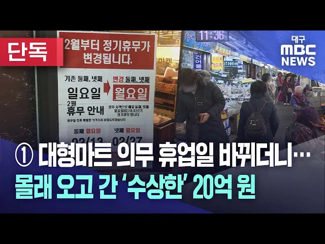 ◀앵커▶대구시가 대형마트 의무휴업일을 평일로 변경할 때 당시 협약에 참여한 대형마트 측과 소상인 측 대표들이 돈을 주고받았다는 소식 며칠 전 전해드렸는데요.뒷돈으로 의무휴업일 변경이 이뤄진 셈이라는 비판이 나오는데, 의무휴업일 변경을 주관한 대구시는 이 거래를 모르고 있었을까요?양관희 기자가 취재했습니다...