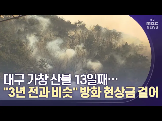 ◀앵커▶대구 가창 산불이 13일째 이어지고 있습니다. 지금까지 25ha의 산림이 불에 탔는데요,건조한 날씨가 이어지는 데다 진화 헬기까지 부족해 불길이 완전히 잡히지 않고 있는 겁니다.주민들은 3년 전에도 비슷한 산불이 있었다며 방화를 의심하고 현상금까지 걸었습니다.양관희 기자가 보도합니다. ◀기자▶대구 가창댐에...