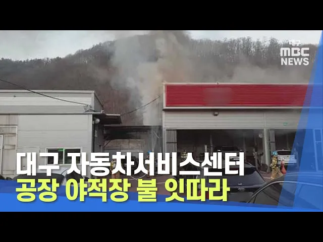 오늘 오전 7시 반쯤 대구시 수성구 상동의 한 자동차 서비스센터 건물에서 불이 나 1시간 만에 꺼졌습니다.인명피해는 없지만 소방서 추산 천300만 원의 재산피해가 났 습니다.오늘 오전 8시 10분쯤에는 대구시 달성군 현풍읍의 한 공장 야적장에서 불이 나 4시간만에 꺼졌습니다.인명피해는 없었고 소방서 추산 260만 원의...