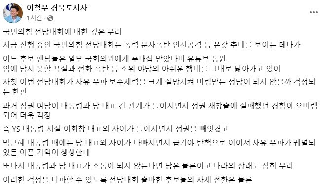사진 출처 이철우 경북도지사 SNS이철우 경상북도지사는 국민의힘 전당대회에 대해 탄식과 우려를 나타냈습니다. 이철우 지사는 SNS를 통해 국민의힘 전당대회가 폭력, 문자폭탄에, 인신공격 등으로 온갖 추태를 보인다면서 이대로면 국민에게 버림받는다고 탄식했습니다. 이 지사는 김영삼 대통령 시절 이회창 당 대표와 ...