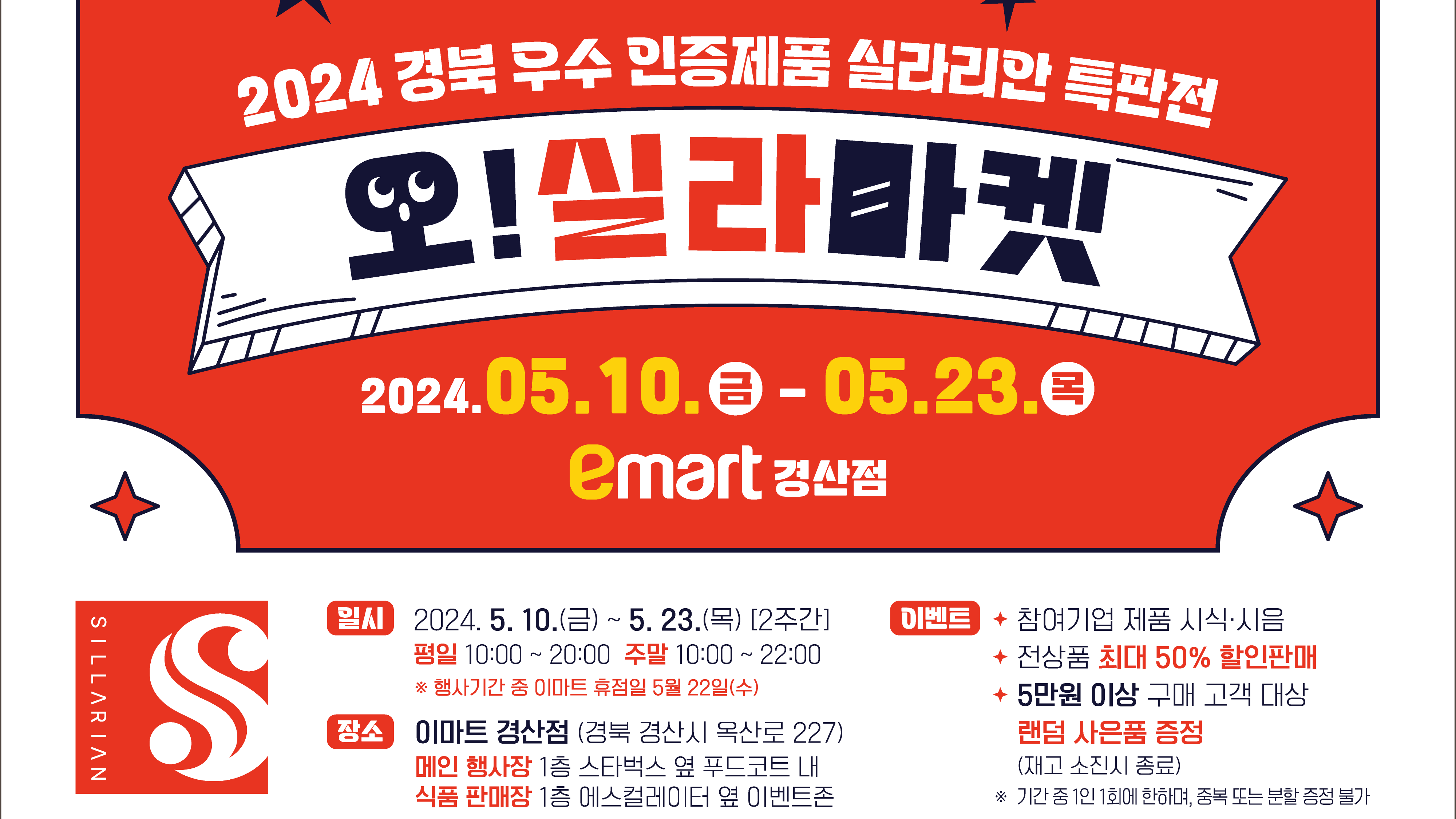 사진 제공 경북도경상북도가 5월 10일부터 23일까지 이마트 경산점에서 '2024 경북 우수 인증 제품 실라리안 특판전'을 엽니다.이번 행사에는 실라리안 기업 23개 사가 참여해 밀키트, 홍삼, 장류, 전통차, 과일음료, 인견 의류·침구, 목공예품 등 3백여 개의 제품을 최대 50% 할인된 가격으로 판매합니다. 실라리안 제품 5...
