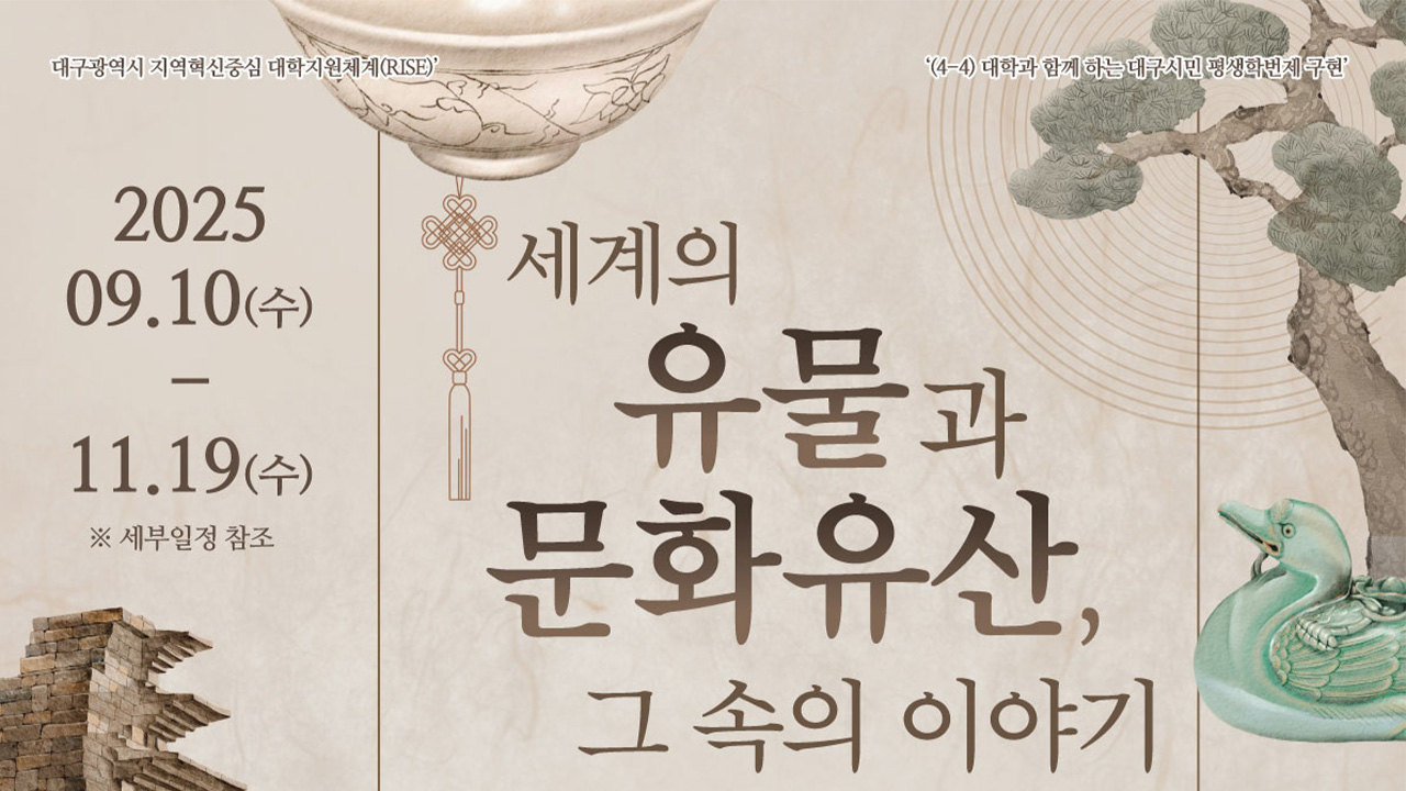 경북대 사학과와 박물관은 대구 경북 지역민과 함께하는 특별강연 '세계의 유물과 문화유산, 그 속의 이야기'를 개최합니다.이번 강연은 9월 10일부터 11월 19일까지 매주 수요일 오후 4시 경북대 박물관 시청각실에서 열리며, 전문가 강연 10회와 현장 답사로 진행됩니다. 대구 라이즈 사업의 일환으로 마련된 이번 강연은...