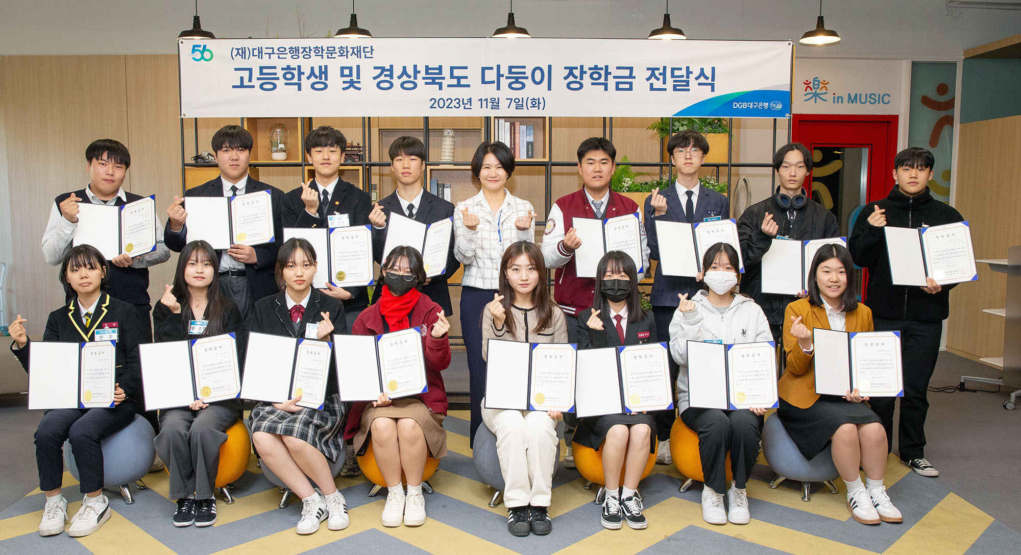 대구은행 장학문화재단은 고등학생과 경상북도 다둥이 등 193명에게 1억 8천만 원의 장학금을 전달했습니다.재단은 고등학생 장학금을 대표적인 장학사업으로 진행해 오다가 2019년 경상북도와 저출산 문제를 극복하기 위한 협약을 맺고 확대 지원하고 있습니다.