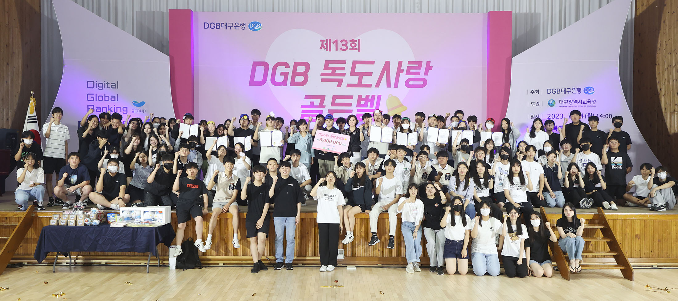 DGB 대구은행이 대구 경북여고에서 제13회 'DGB 독도 사랑 골든벨' 대회를 개최했습니다.DGB 독도 사랑 골든벨은 독도에 대한 관심을 높이고 독도 수호와 애국심을 고취하자는 취지에서 DGB 대구은행이 주최하고 대구시교육청이 후원해서 진행하고 있는 장학사업입니다.13회째를 맞이한 2023년 대회는 대구·경북지역 고등학...