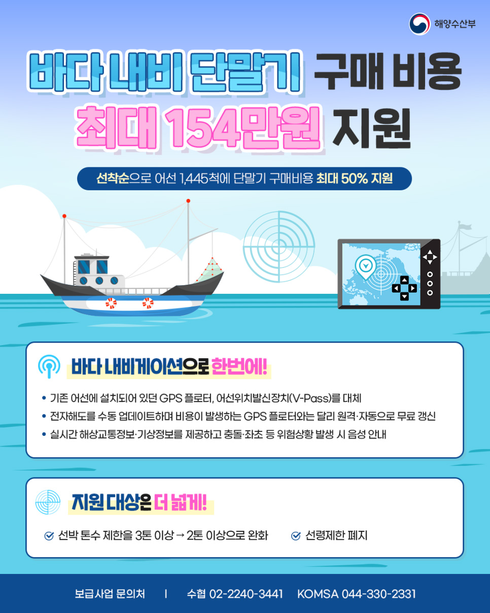 해양수산부는 어선 천 4백여 척을 대상으로 바다 내비게이션 단말기 보급사업을 진행합니다.신청하는 어선에 대해 바다 내비게이션 단말기 구입자금의 절반인 최대 154만 원까지 지원합니다. 해수부가 2021년부터 세계 최초로 시행하는 바다 내비게이션 사업은 전자식 바다지도를 비롯해 기상정보와 위험정보를 실시간 제공...