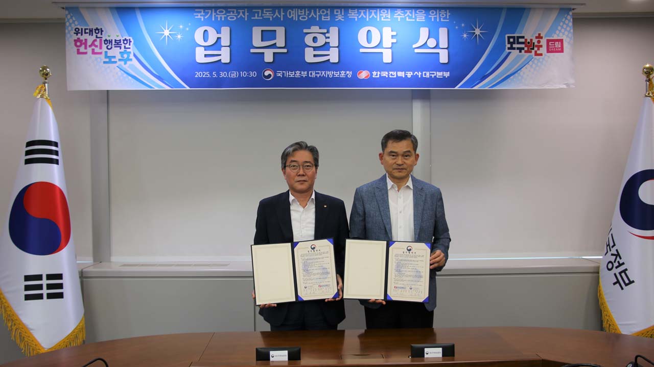 대구지방보훈청은 5월 30일 정부대구지방합동청사에서 한국전력 대구본부와 보훈대상자 고독사 예방과 복지 지원 강화를 위한 업무협약을 체결했습니다.이번 협약은 지역 내 국가유공자와 보훈 가족의 삶의 질 향상과 예우 분위기 확산을 목적으로 1인 가구 대상 안부 살핌 서비스 제공을 통한 안전 지원체계 구축, 복지 사...