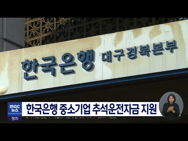 한국은행 대구·경북본부는 추석을 앞두고 지역중소기업들을 위한 운전자금을 지원합니다.대구·경북지역 중소기업에 임금이나 상여금, 원자재 대금 결제에 필요한 돈을 대출해준 금융기관을 대상으로 3억원 한도내에서 만기 1년 이내의 운전자금을 지원합니다.한국은행은 중소기업에 돈을 대출해 준 금융기관에게 대출액의 ...