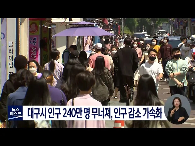 대구시 인구수가 240만 명 선이 무너졌습니다. 대구시에 따르면 지난달 기준 대구의 인구수는 주민등록 기준 2백 39만 7천 646명으로 집계됐습니다. 대구시의 인구는 지난 2011년 250만 7천명이던 것이 10년이 채 안돼 10만 9천명이 줄어 한 해 평균 만 명씩 줄어든 것으로 나타났습니다