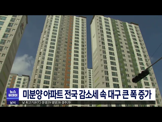 전국의 미분양 아파트가 줄어들고 있는 가운데 대구는 큰 폭으로 늘었습니다.국토교통부에 따르면 지난 5월 전국의 미분양 아파트는 만 5천 660호로 한 달전보다 0.9% 줄었습니다.하지만 대구는 890여 호에서 천 백 80여 호로 32%늘어, 전국에서 가장 크게 늘었습니다.준공후 미분양 아파트는 경북이 천 6백여 호로 경남 다...