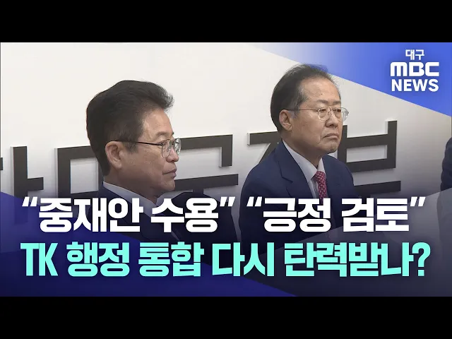 ◀앵커▶홍준표 대구시장이 무산을 선언한 대구·경북 행정 통합이 다시 탄력을 받을 전망입니다.행정안전부가 대구시와 경상북도에 중재안을 제시했는데, 대구시는 중재안을 수용했고, 경상북도 역시 긍정적으로 검토하기로 했는데요.논의가 중단된 지 한 달 보름 만에 행정 통합은 또 지역의 이슈가 되고 있습니다.이번에는 ...