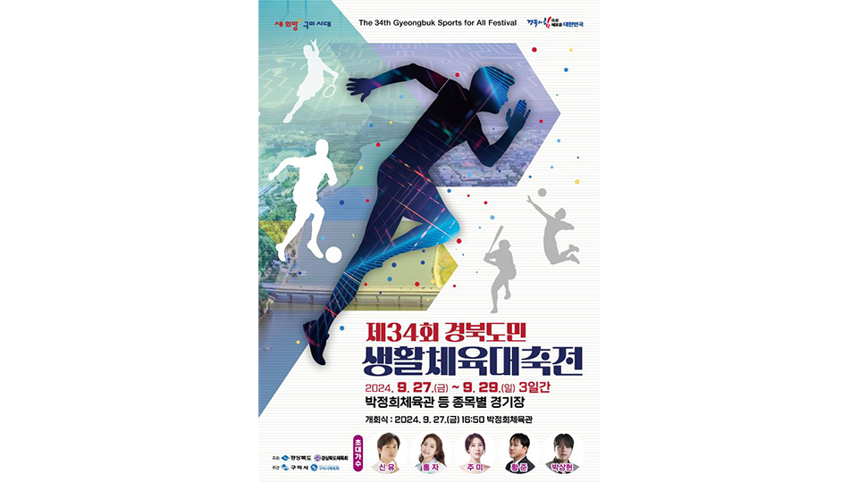 경상북도 생활체육 동호인들의 최대 축제인 '제34회 경북도민생활체육대축전'이 9월 27일부터 사흘 동안 구미 박정희체육관과 인근 종목별 경기장에서 열립니다. '새 희망 구미에서 하나 되는 경북의 힘!'이란 구호 아래 개최되는 이번 대회에는 도내 22개 시군, 만여 명의 선수와 임원이 참가해 축구, 야구, 그라운드골프 ...