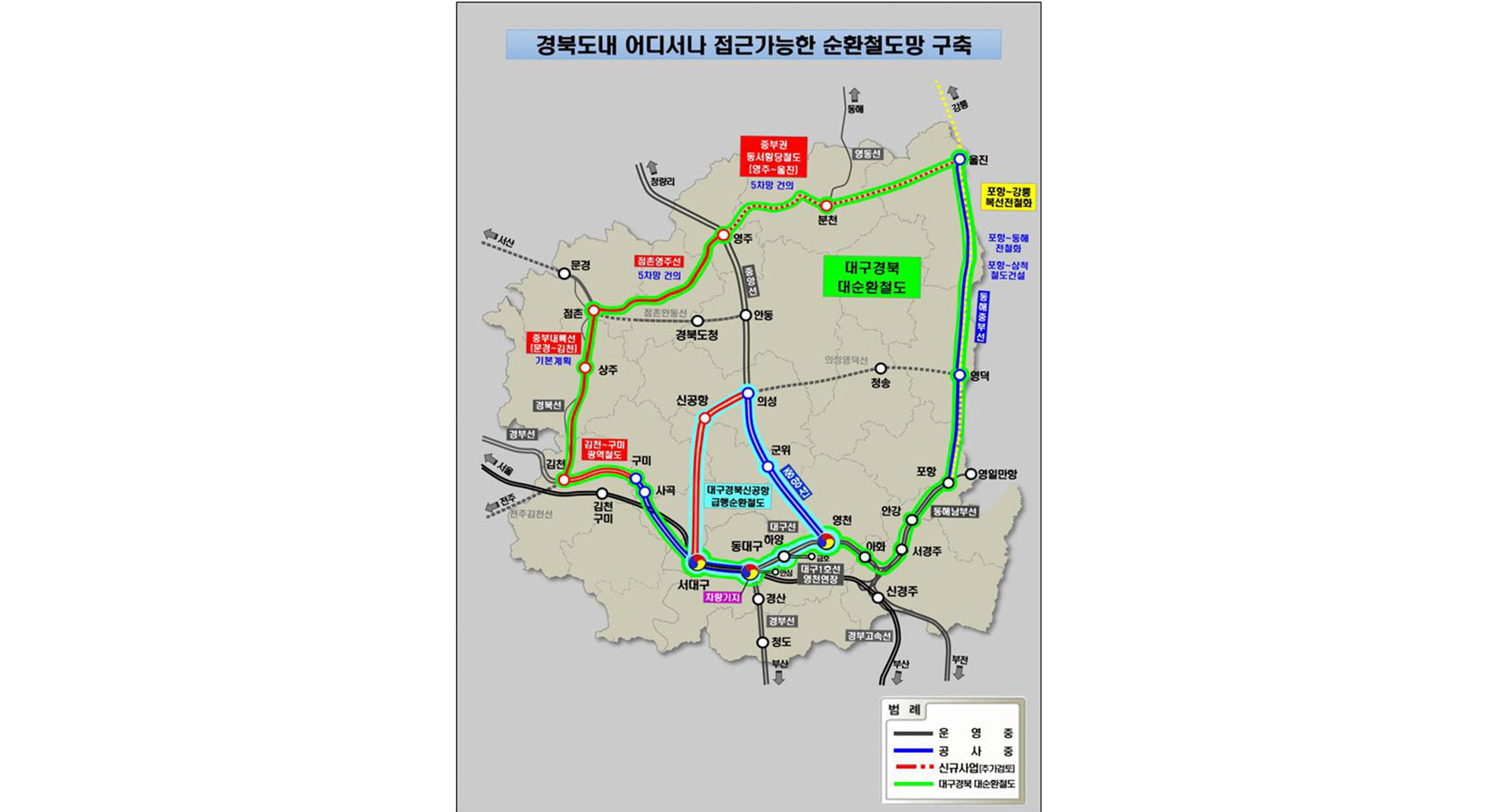 사진 제공 경상북도경상북도는 대구·경북의 순환 철도망을 완성하기 위해 고속철도 3개, 일반철도 13개, 광역철도 5개 등 모두 21개의 신규 철도사업을 국토부에 건의했습니다. 경상북도는 2026년부터 2035년까지 추진하는 '제5차 국가철도망 구축계획'에 대구·경북 행정 통합 메가시티 발전 구상 전략에 따라, 대구경북신...