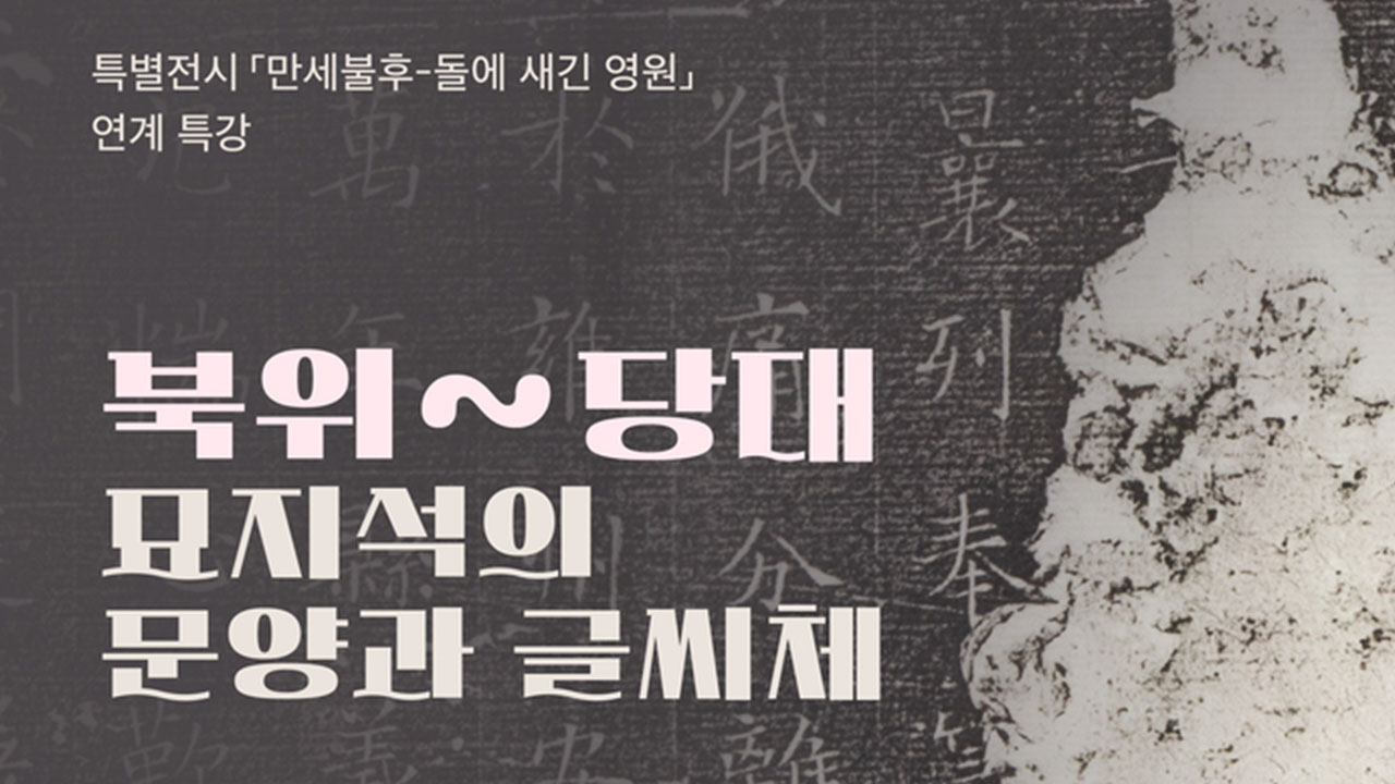 국립대구박물관은 특별전 '만세불후-돌에 새긴 영원'과 연계한 특별 강연 '북위~당대 묘지석의 문양과 글씨체'를 7월 4일 오후 2시에 엽니다.'만세불후-돌에 새긴 영원'전 도록 중 '구 양 씨 부인 묘지'와 '원 씨 부인 묘지명'에 대한 글을 쓴 한국학중앙연구원 이완우 명예교수가 강의합니다.이번 강의는 중국 북위 시대 ...