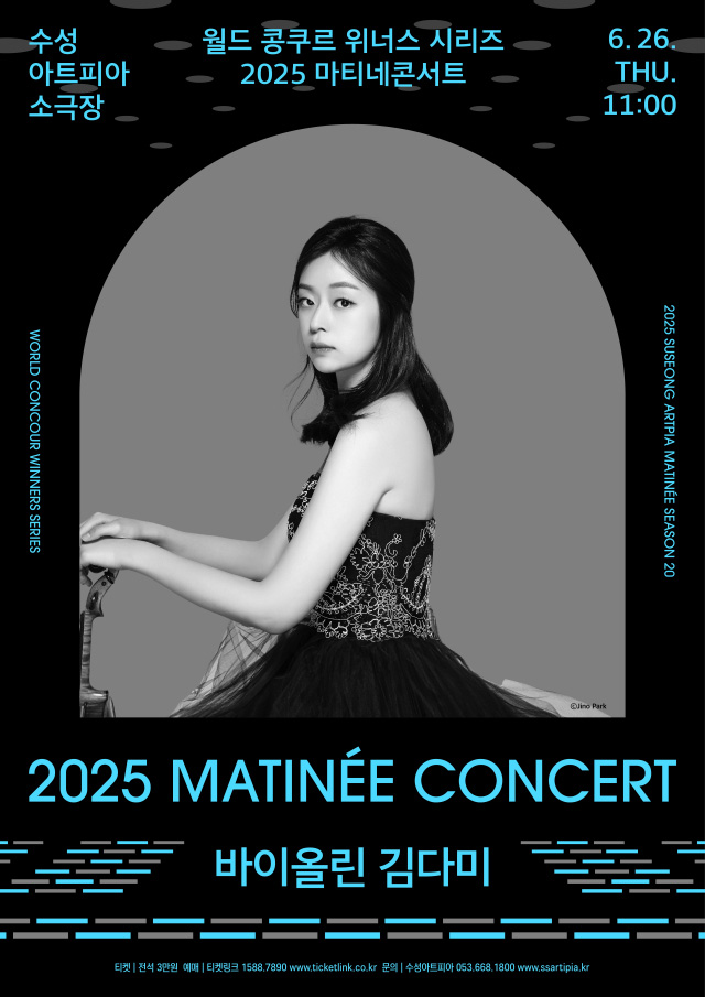 대구 수성아트피아는 6월 26일 오전 11시 소극장에서 '월드 콩쿠르 위너스 시리즈' 세 번째 무대로 바이올리니스트 김다미 공연을 엽니다.김다미는 독일 하노버 요아힘 국제 콩쿠르 우승, 파가니니 콩쿠르 국제 콩쿠르에서 1위 없는 2위, 나고야 무네츠구 국제 콩쿠르 우승 등을 비롯한 세계 무대에서 실력을 인정받는 바이...