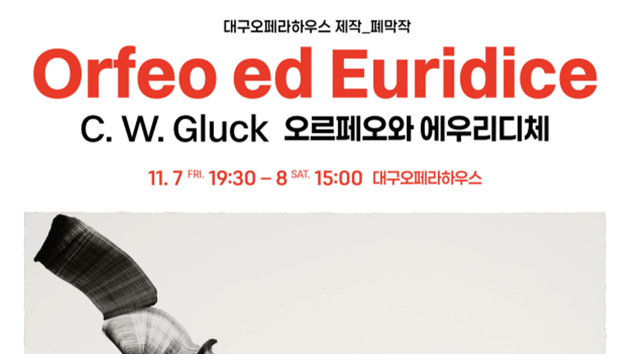 대구오페라하우스는 제22회 대구 국제 오페라 축제의 폐막작으로 글룩의 오페라 '오르페오와 에우리디체'를 11월 7일 저녁 7시 30분과 토요일인 8일 오후 3시에 대구오페라하우스 대극장 무대에 올립니다.제22회 대구 국제 오페라 축제의 마지막 작품 '오르페오와 에우리디체'는 고대 그리스 신화를 바탕으로 사랑하는 아내...