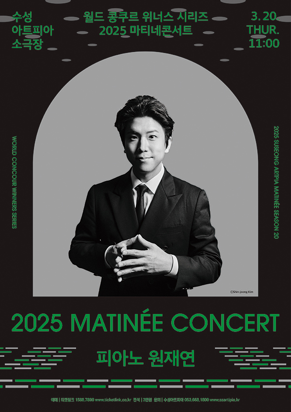 사진 제공 수성아트피아대구 수성아트피아가 기획한 2025년 첫 '마티네 콘서트'가 3월 20일 오전 11시 수성아트피아에서 피아니스트 원재연을 초청해 열립니다. 이번 시리즈는 국제 유명 콩쿠르에서 우승한 연주자를 초청해 연주와 함께 해설을 곁들이는 방식으로 합니다.피아니스트 원재연은 제61회 이탈리아 부조니 국제 ...