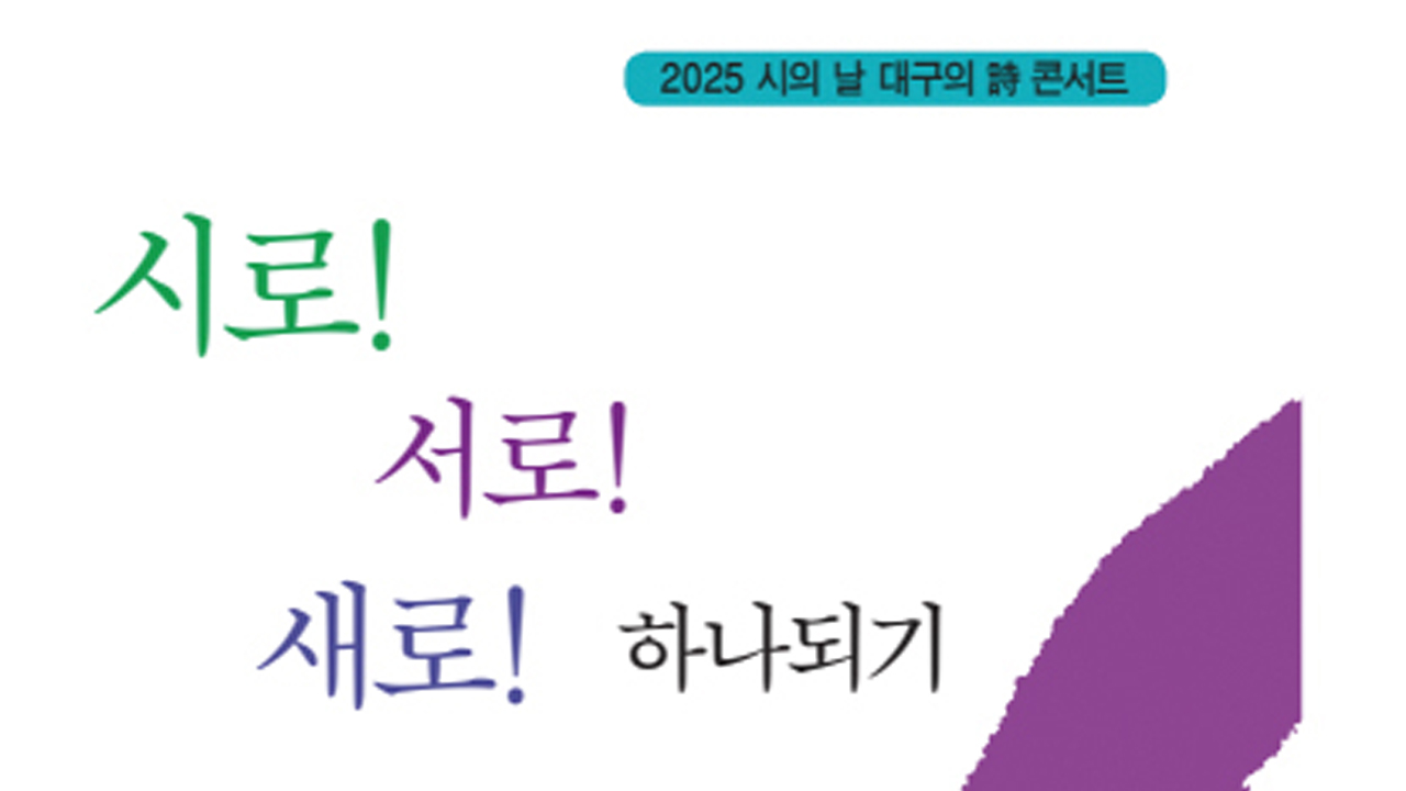 자료 제공 대구시인협회대구시인협회는 10월 30일부터 11월 1일까지 3일간 앞산 빨래터공원에서 '2025 시의 날 대구의 시 콘서트'를 엽니다. 2025년 행사는 '시로! 서로! 새로! 하나 되기'를 주제로 시민과 시인이 하나 되는 축제로 만듭니다. 첫째 날인 30일(목)에는 이영철·권기철 화가가 함께하는 시 엽서전과 캐리커처 ...