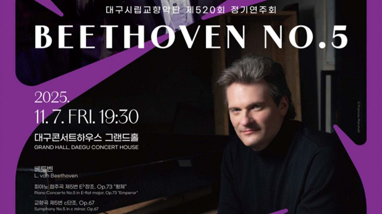 대구시립교향악단이 11월 7일 저녁 7시 30분, 대구콘서트하우스 그랜드홀에서 '베토벤 No.5'를 부제로 '제520회 정기연주회'를 합니다.이번 무대에서는 베토벤의 대표작인 피아노 협주곡 제5번 '황제'와 교향곡 제5번을 함께 연주합니다. 지휘봉은 백진현 음악감독 겸 상임지휘자가 잡고, 피아노 협연은 독일의 피아니스트 ...