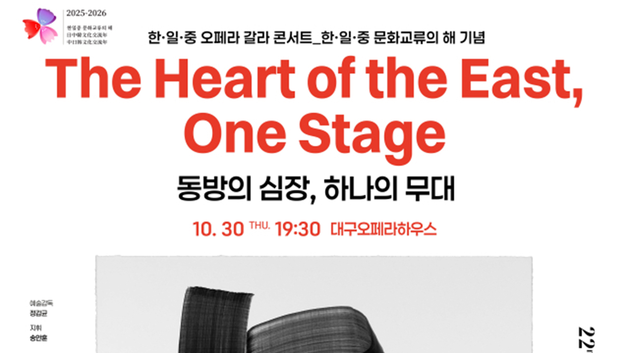 자료 제공 대구문화예술진흥원대구오페라하우스는 오는 10월 30일 저녁 7시 30분, 제22회 대구 국제 오페라 축제의 특별 공연으로 '2025 한·일·중 오페라 갈라 콘서트 동방의 심장, 하나의 무대'를 선보입니다.이번 공연은 2025-2026 한·일·중 상호 문화 교류의 해를 기념해 아시아를 대표하는 세 나라의 주요 오페라 극장...