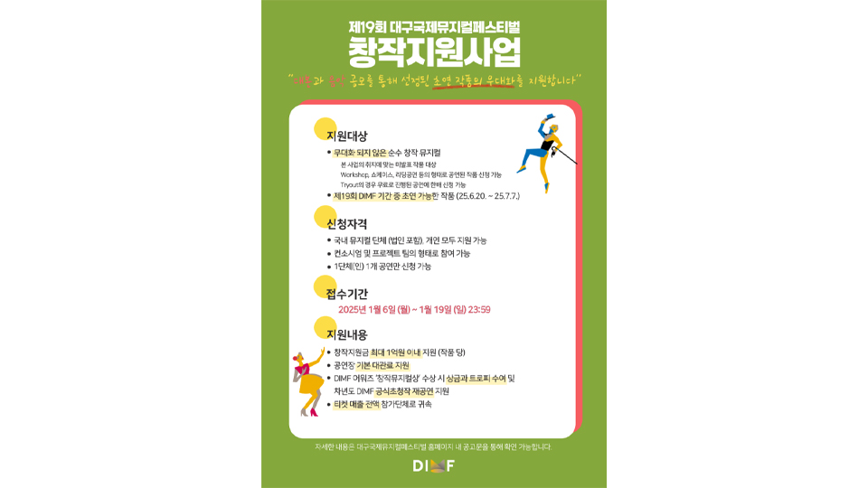 대구 국제 뮤지컬 페스티벌이 2025년 1월 6일부터 19일까지 '제19회 DIMF 창작 지원사업' 공모 신청을 받습니다. 선정된 작품은 2025년 대구 국제 뮤지컬 페스티벌에서 초연합니다. 공모 대상은 2025년 6월 시작하는 축제 기간에 공연이 가능한 초연 작품입니다. 참가 작품은 최소 1시간 20분 이상이며, 가족과 어린이 뮤지...