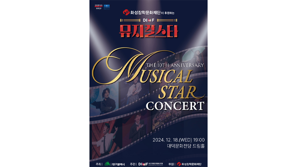대구 국제 뮤지컬 페스티벌은 12월 18일 저녁 7시 대덕문화전당에서 '뮤지컬 스타 10주년 콘서트'를 엽니다. 이번 콘서트는 역대 출연자들과 제10회 본선 진출자들이 출연하는데, DIMF 뮤지컬 스타의 역사와 성과를 조명하고, 앞으로 도약을 위해 기획했습니다. 첫 회 출연자인 조환지 이 외에도 노용원, 김채은, 박이안 등...