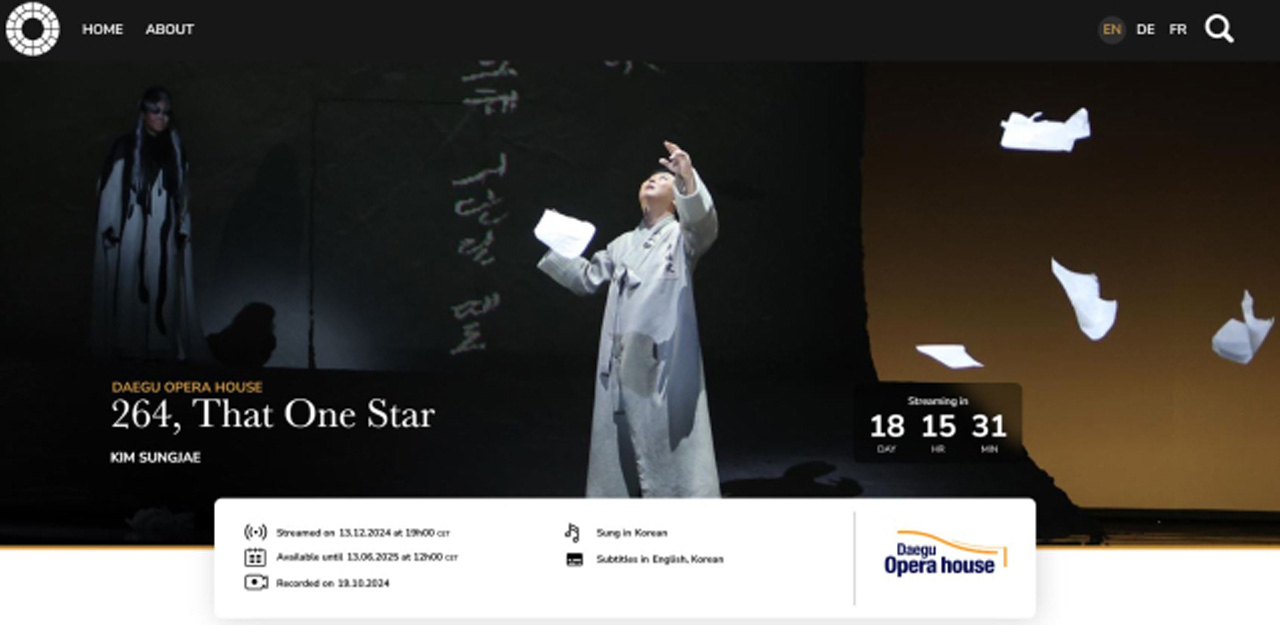 사진 제공 대구오페라하우스대구오페라하우스가 만든 '264, 그 한 개의 별'이 온라인 스트리밍 플랫폼 '오페라비전을 통해 12월 14일, 토요일에 전 세계에 무료로 공개됩니다.대구오페라하우스는 지난 8월 유럽 기반의 세계적인 오페라 협회인 '오페라 유로파에 가입해 이들 스트리밍 플랫폼인 오페라비전을 통해 스트리밍...
